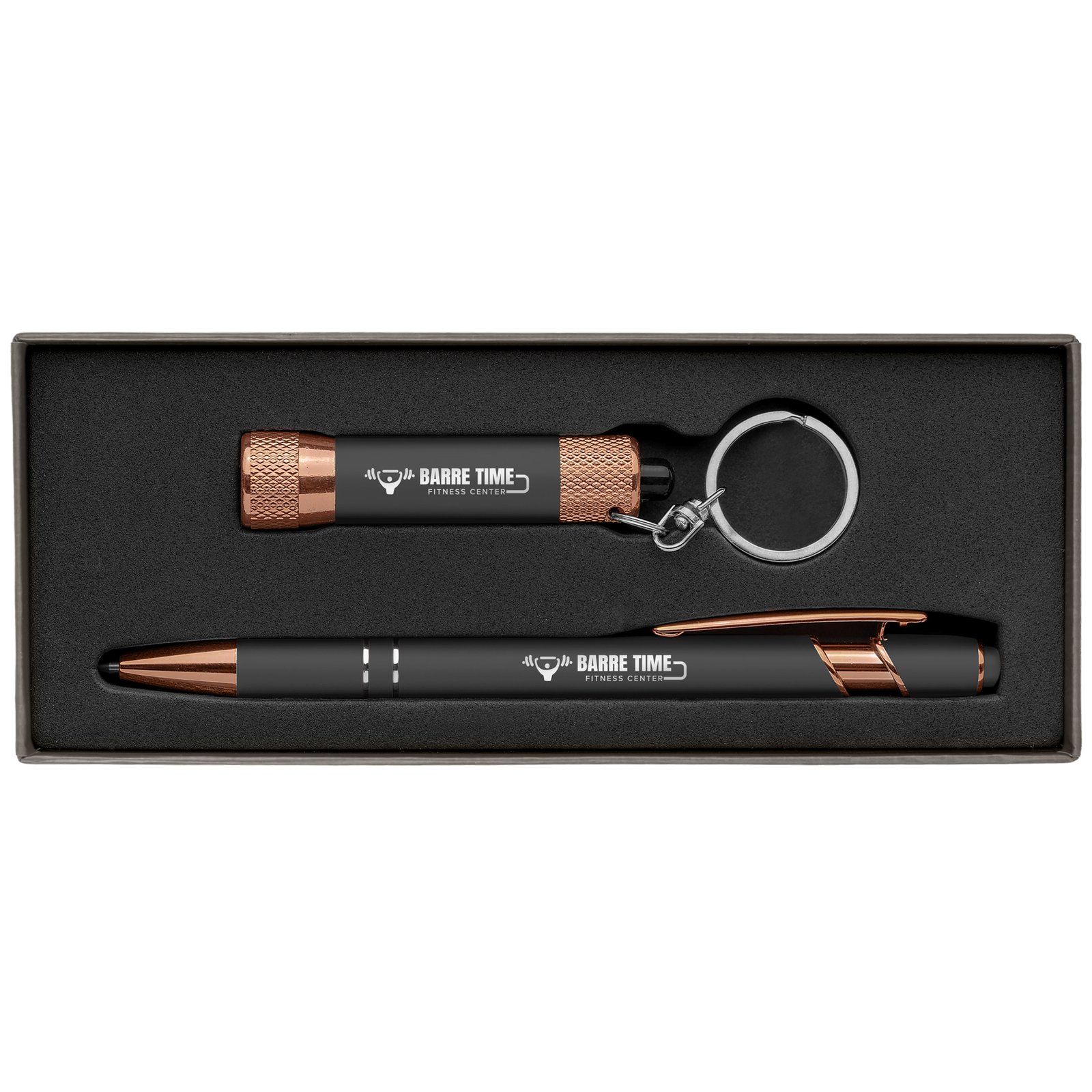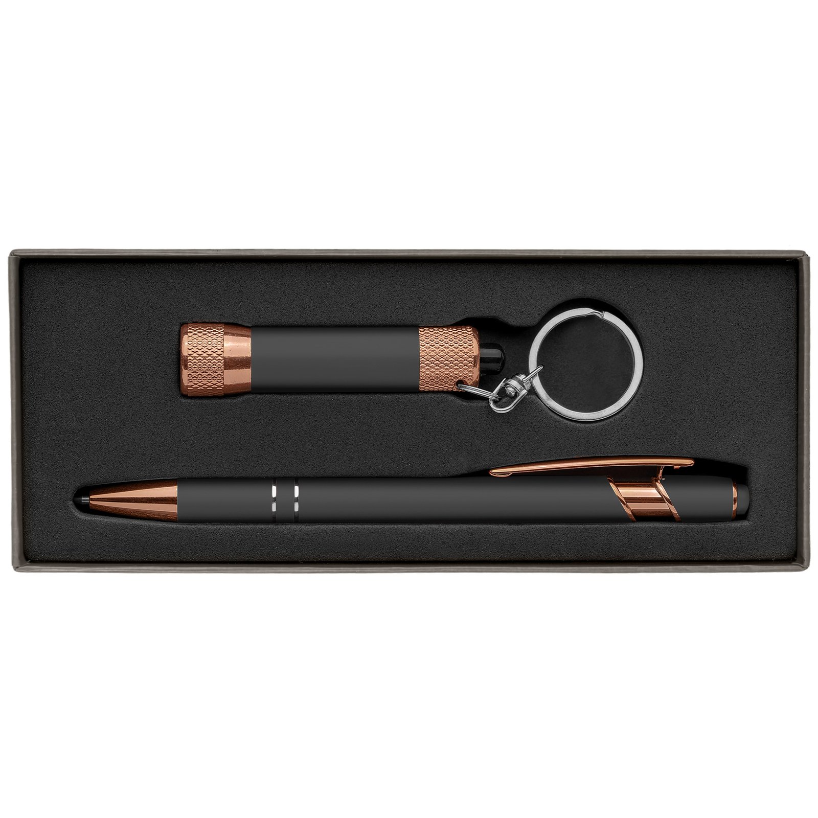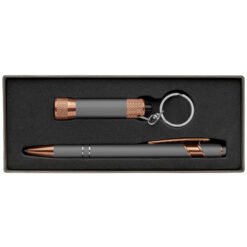 This gift set brings together two new rose gold and metallic soft-touch products, the Ellipse Softy ballpoint pen and Chroma Softy LED flashlight. Both products are laser engraved and presented in an attractive gray gift box. Choose from a variety of soft-touch metallic colors to showcase your company name, logo or advertising information. This stylish pen and flashlight gift set is perfect for corporate events and holiday gifts.