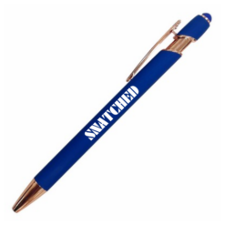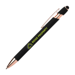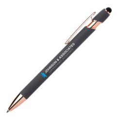 Elora Stylish comfort, rubberized style plunger action aluminum pen. Complete with PDA Stylus and Rose Gold tips and trim. Option: Velvet sleeves is an additional option.