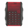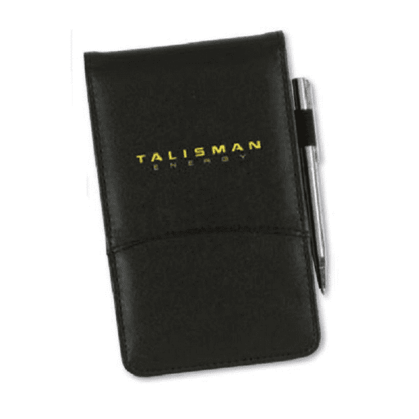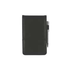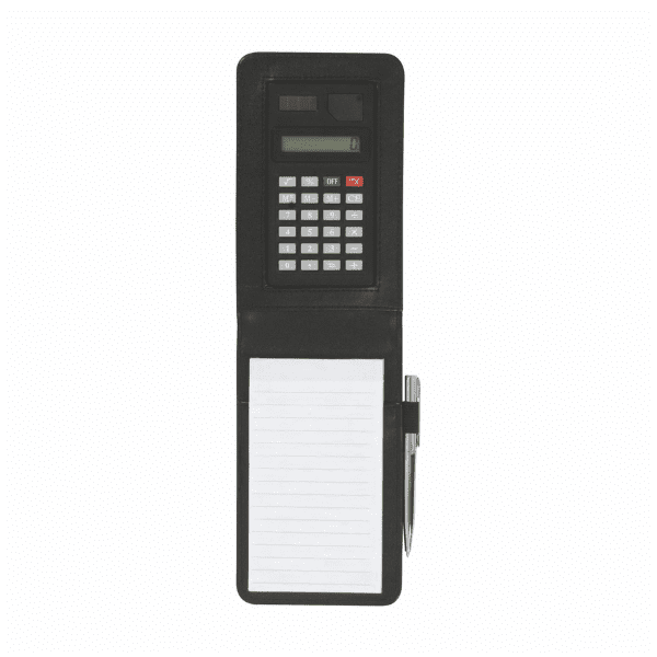Faux leather top fold notebook with calculator inside on top, notepad on bottom, & silver metal pen (no imprint) in a side elastic pen loop. 3 1/2″ W x 5 3/4″ H