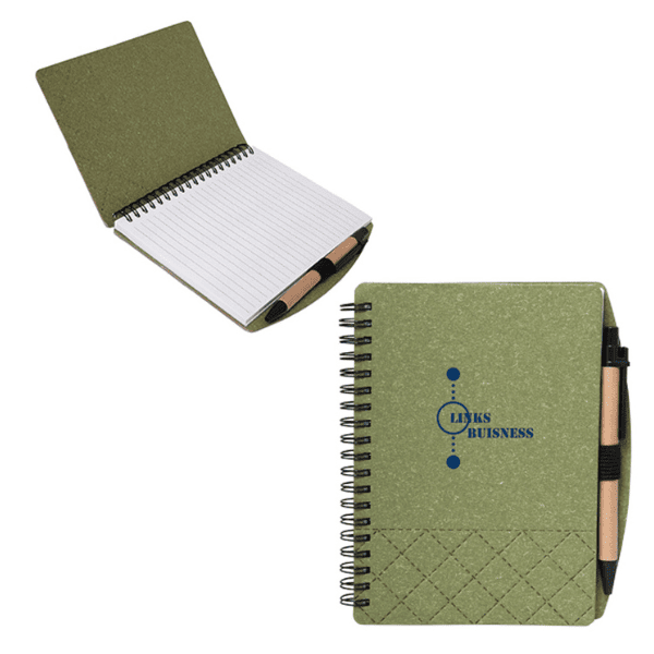 Cover has a speckled marble-like appearance Spiral binding Includes 70 sheets of lined 70 gram paper Elastic pen loop Includes Recycled Paper Pen, natural/black with blue ink Diamond quilted pattern along bottom third of the cover