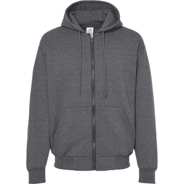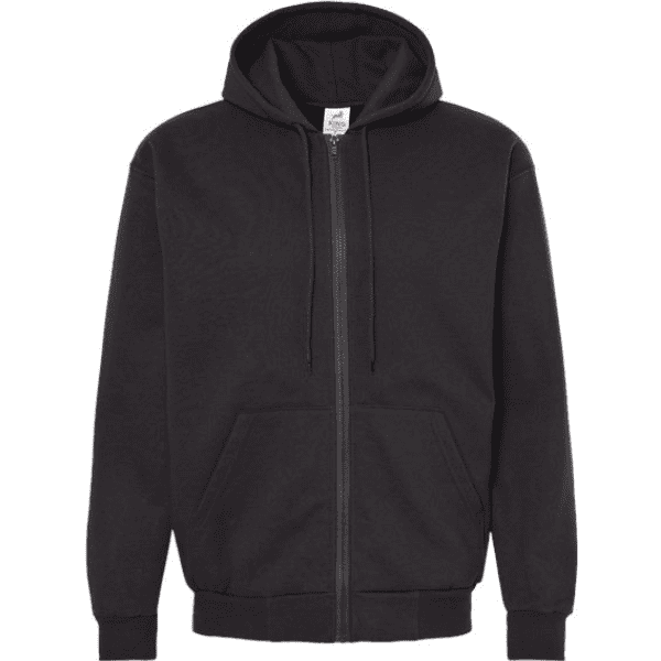 Made in Canada, this custom full zip heavy weight fleece jacket is made with 95% cotton/5% lycra and features a double-needle 2×1 ribbed cuffs and waist, set in sleeves and matching draw cords. 15 oz.