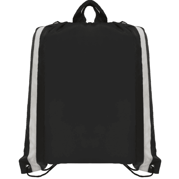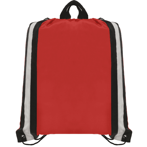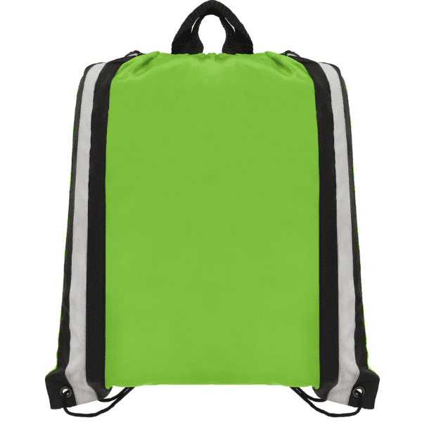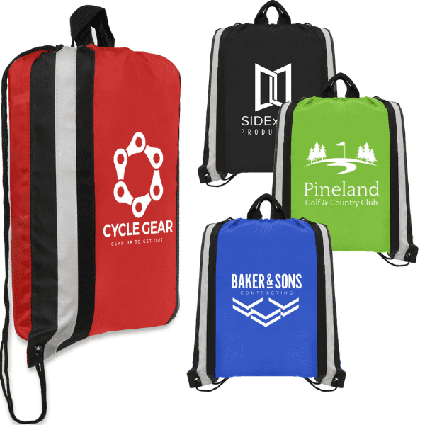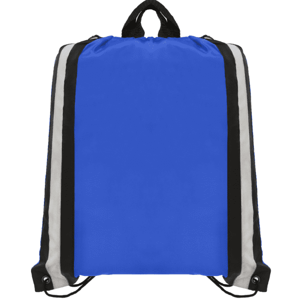Durable and versatile, the Klondike drawstring backpack features two prominent reflective safety strips to help stay visible at night. This backpack also has a convenient carrying loop at top. This item packs flat for easy storage, and makes a great item for sporting events, tradeshow events, school activities—and so much more! Customize with a white silkscreen imprint. Measuring 12.87″ W x 15.71″ H.