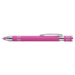 An upscale-looking metal pen with a comfortable, rubberized soft touch finish. Featuring a medium ballpoint and a touchscreen capacitive stylus, the Marin Softy pen makes a great premium business gift. Select from a variety of vibrant barrel colors, all adorned with chrome accent rings, and customize it with your laser engraved logo.