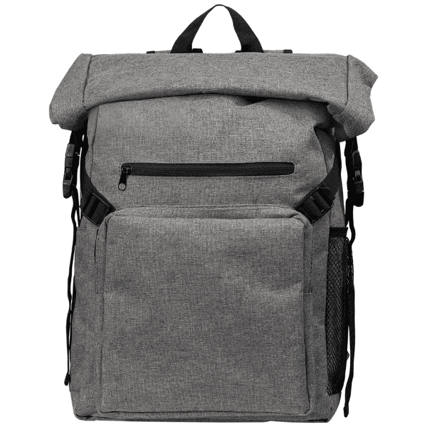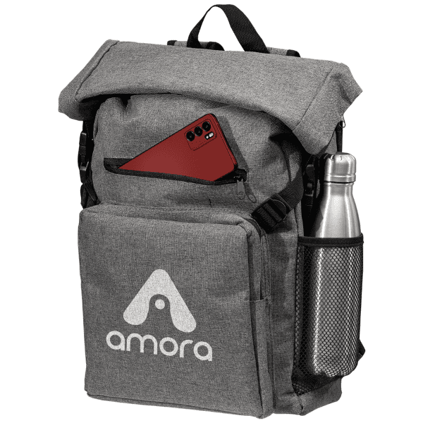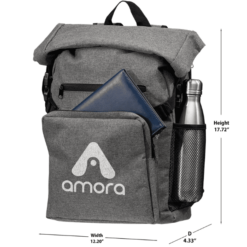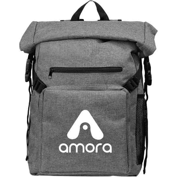This one does it all! The Metropolis Backpack offers a trendy look that makes branding pop. The top roll closure design and the two-tone look appear sophisticated and high-value. Enjoy comfortable, convenient toting, including a luggage sling and grab handle. Plus, enjoy the perk of side pockets for drinkware. Customize with your 1-color silkscreen logo.