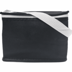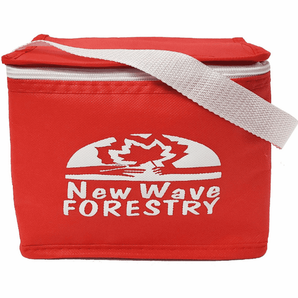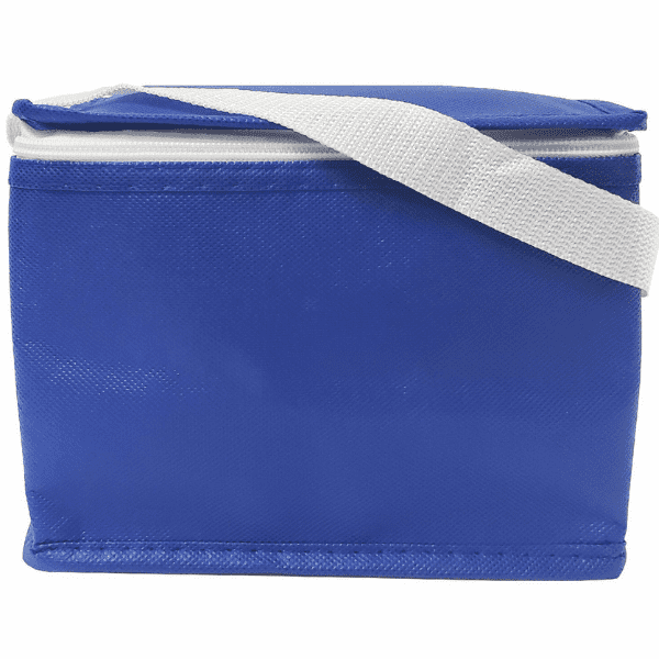 3 sided top zipper cooler/lunch bag with white handle and thermal lining Product holds 6, 355 ml cans. (Additional duties will apply, if shipping to the USA). 7 3/4″ W x 6 1/2″ H x 5 1/2″ D