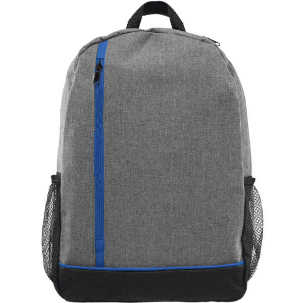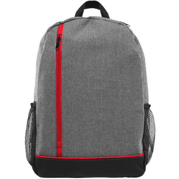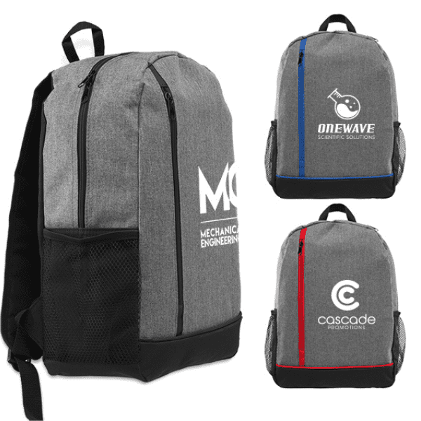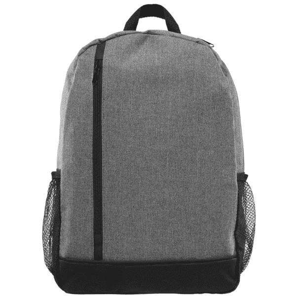 A stylish and versatile backpack for any adventure or day trip. The main compartment has a zipper closure, keeping contents securely in place, while the two outside mesh pockets allow for quick and easy access to frequently used items like a water bottle or pen. This backpack has sturdy adjustable straps and a carrying loop at top. A contemporary heather gray material is predominately featured on this backpack along with black accent panels. Customize with your choice of trim color and a white silkscreen imprint. Measuring 11″ W x 15.5″ H x 5.5″ D.