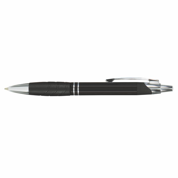 Orillia aluminum barrel, metallic clip, plunger action ballpoint pen also features a 2 ring center accent band wavy line textured comfort grip, metallic grooved plunger, and metallic tip, complete with a Magnusrite jumbo plastic medium point black ink refill. A velvet sleeve is an extra option.