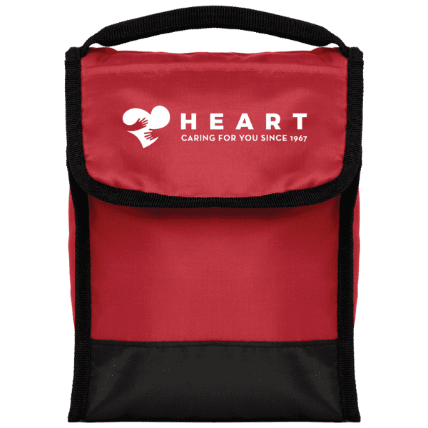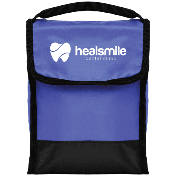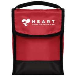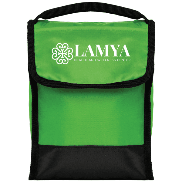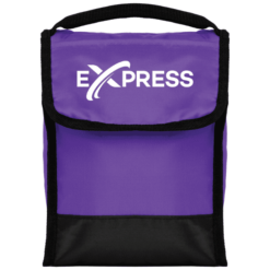 This insulated lunch bag has a PEVA lining to help keep contents fresh, along with a front pocket and clear ID holder on the back for easy identification in the lunchroom. Black carrying handle and accents create an added color contrast. Customize the front flap with a 1-color silkscreen imprint.