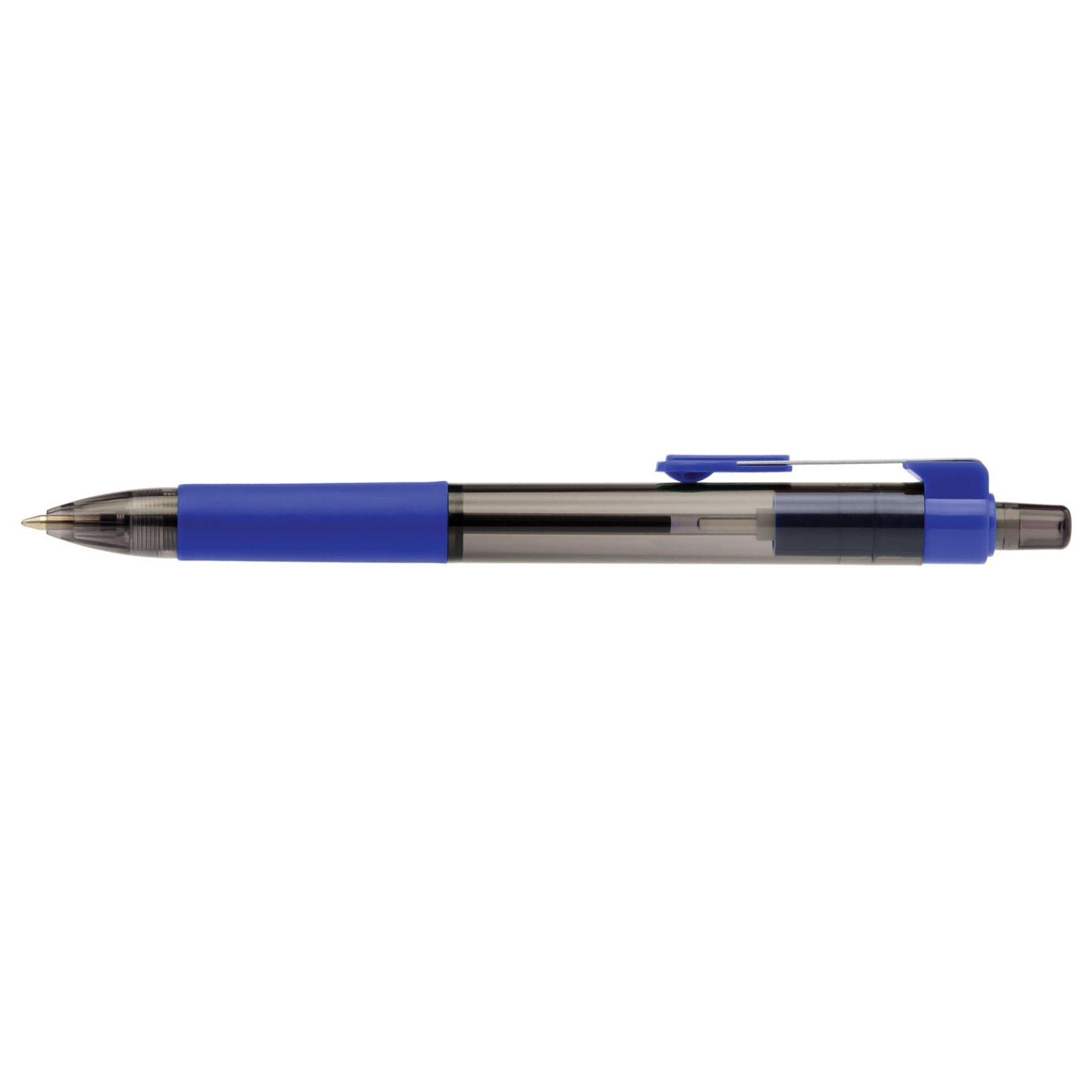 This plastic ballpoint pen features a smoky-black translucent barrel and accents, including the plunger. The slightly wider barrel features a soft-touch grip for added writing comfort. It features our gel-like EverSmooth hybrid ink for an extraordinary writing experience. Customize with a white silkscreen imprint.