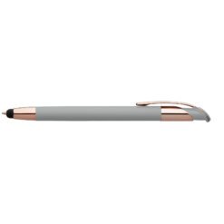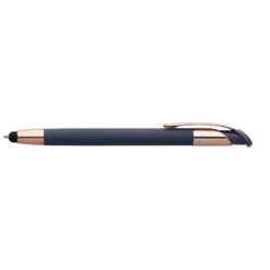 The Venice Softy Rose Gold metal pen features luxurious soft-touch barrels, paired with premium rose gold trim that highlights the elegant, curved clip design. The capacitive stylus adds helpful touchscreen functionality. Customize with your logo using precision laser engraving.